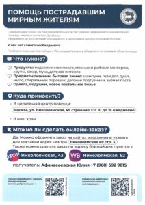 По благословению Святейшего Патриарха Московского и всея Руси КИРИЛЛА на Светлой седмице производится сбор продуктов питания, средств гигиены и бытовой химии для пострадавших мирных жителей и беженцев из зоны проведения Специальной военной операции.